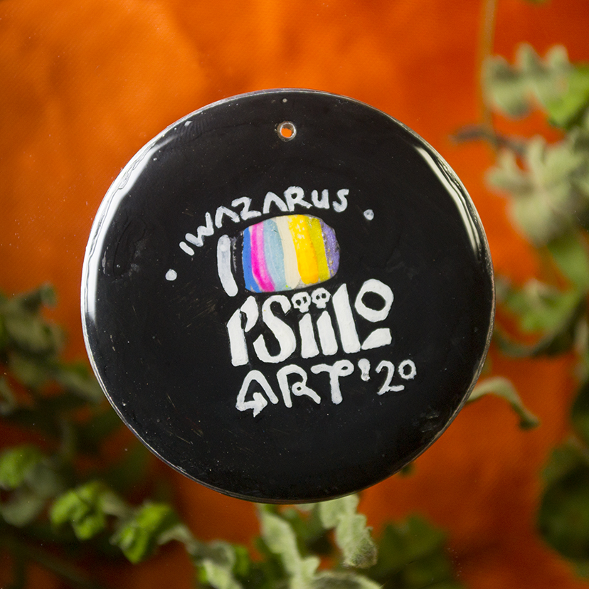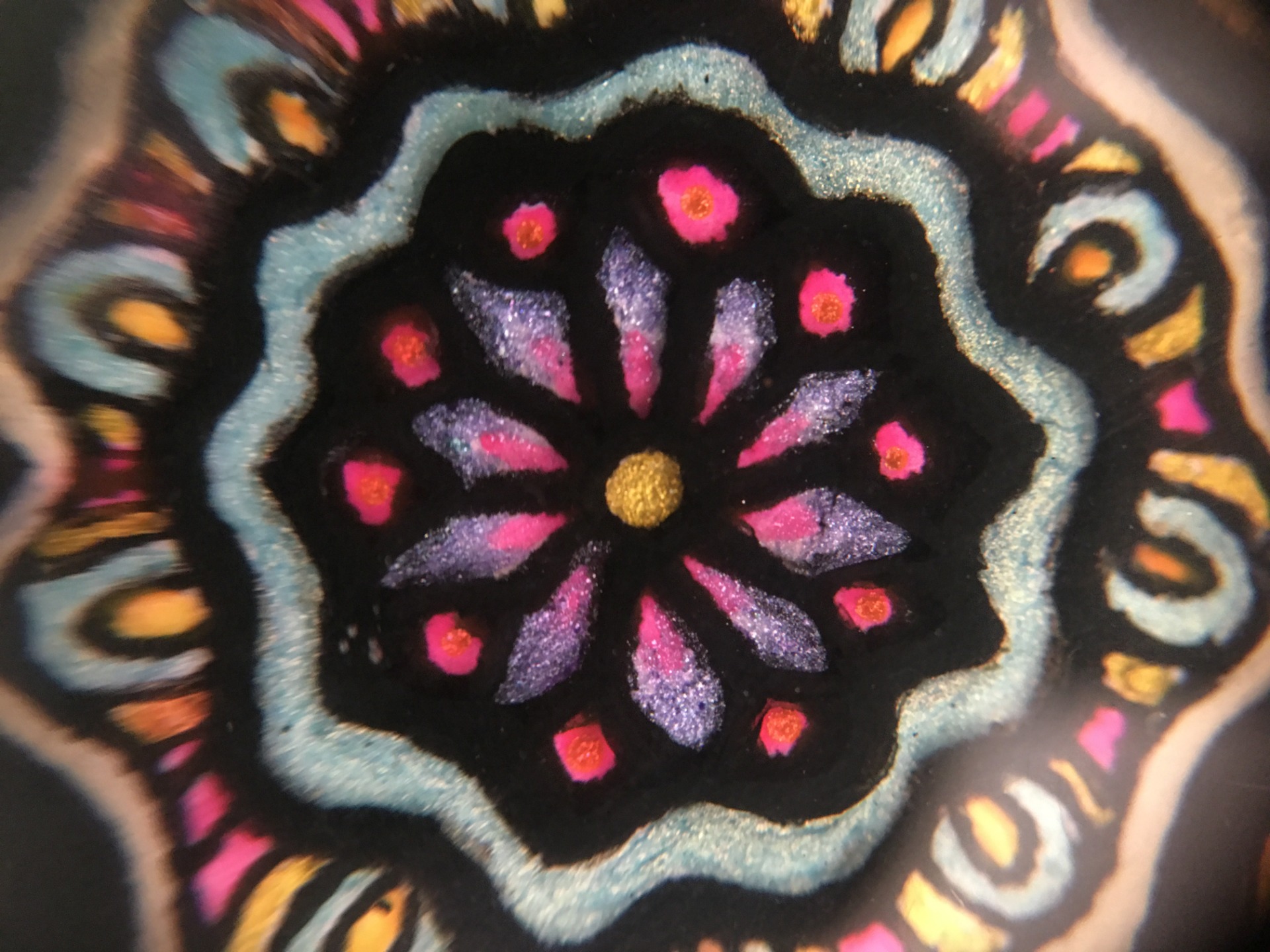 La base es un tazo repintado con suma delicadeza y reutilizado para llevar como accesorio.