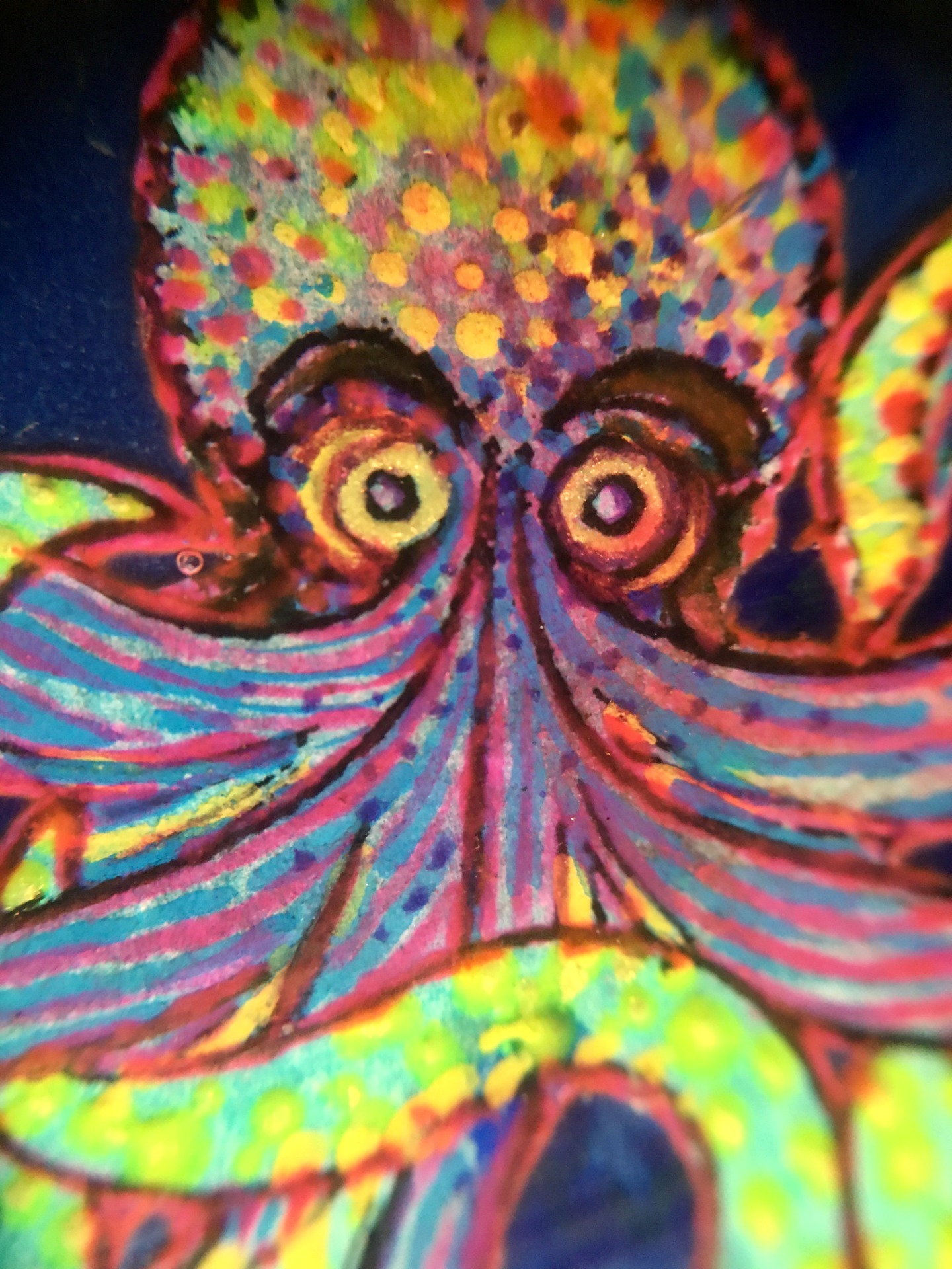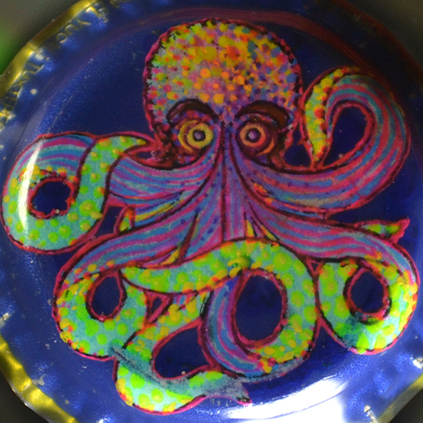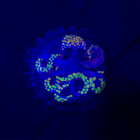 Pintado a mano con pintura acrílica, flourece con luz ultravioleta.